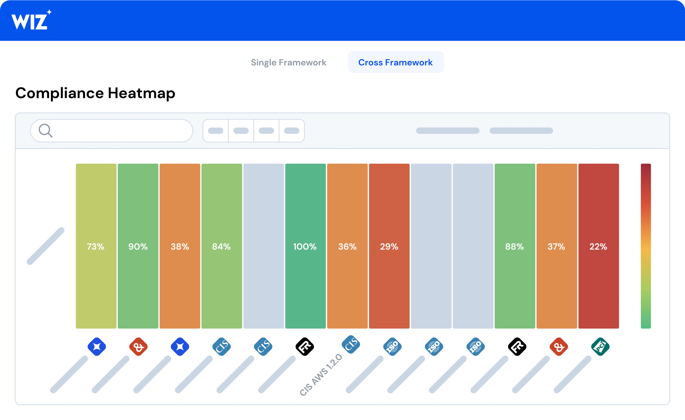 Wiz permite evaluaciones de cumplimiento automatizadas continuas y proporciona puntos de postura a través de marcos de conformidad estándar de la industria o marcos personalizados. Usted puede evaluar rápidamente su conformidad, reportarlo a su liderazgo con confianza y centrar sus equipos en lo que más importa.